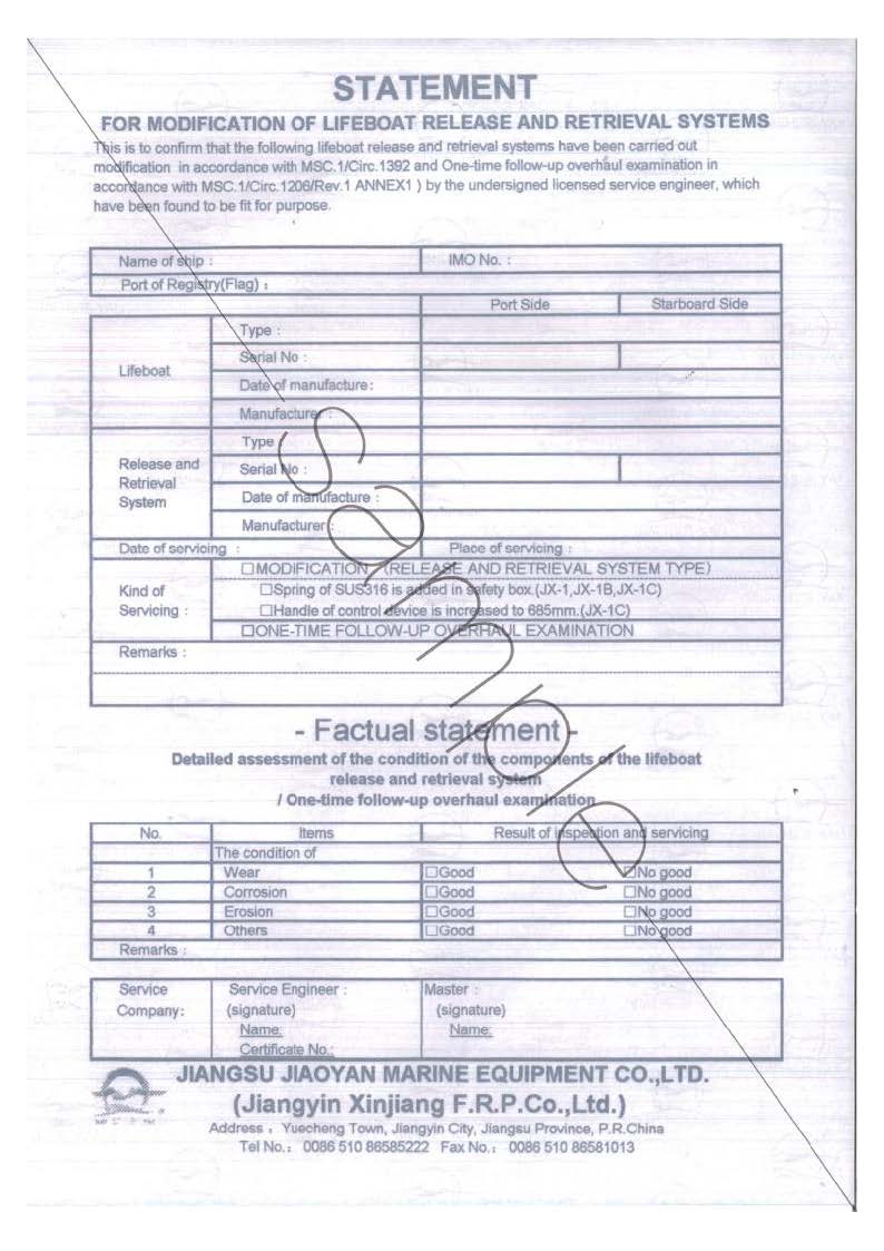 我司于2014年7月1日已发布过声明,现再次郑重声明如下,希望广大用户朋友本着对船员生命负责,注重安全的原则,谨慎选择救生艇设备服务商.